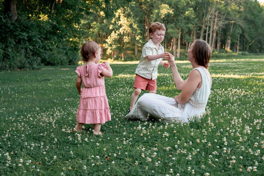Family Snuggles close during a golden hour family photo session in the woods of Akron, Ohio with photographer Brittney Emerson behind the camera